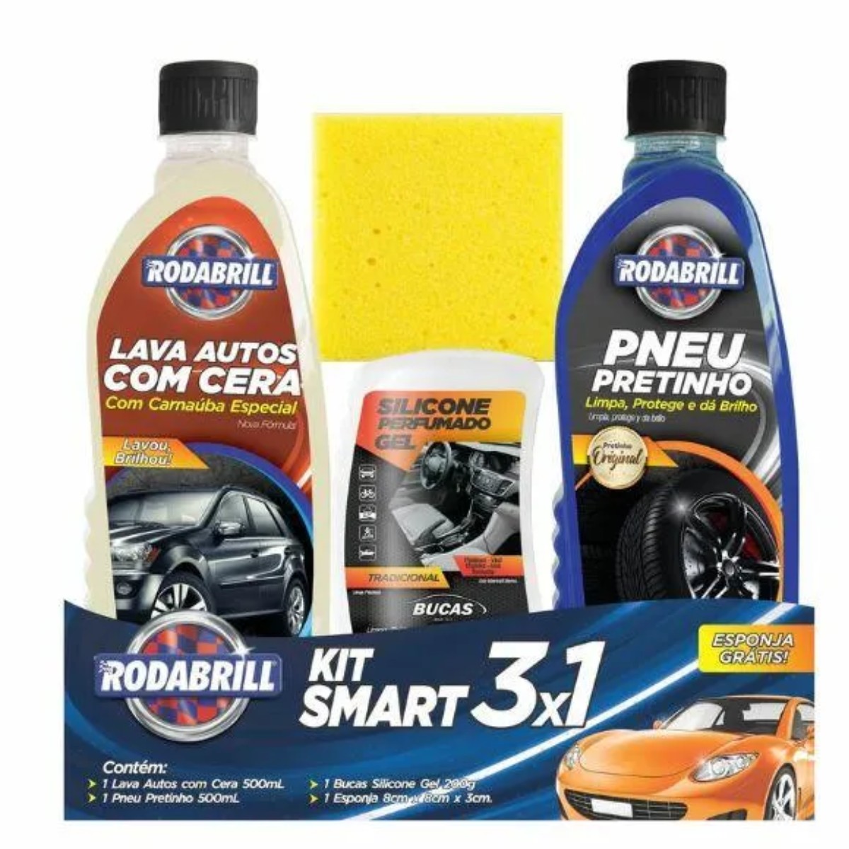 1 Lava Autos com Cera 500mL, 1 Pneu Pretinho 500mL, 1 Bucas Silicone Gel 200g, 1 Esponja 8cm x 8cm x 3cm